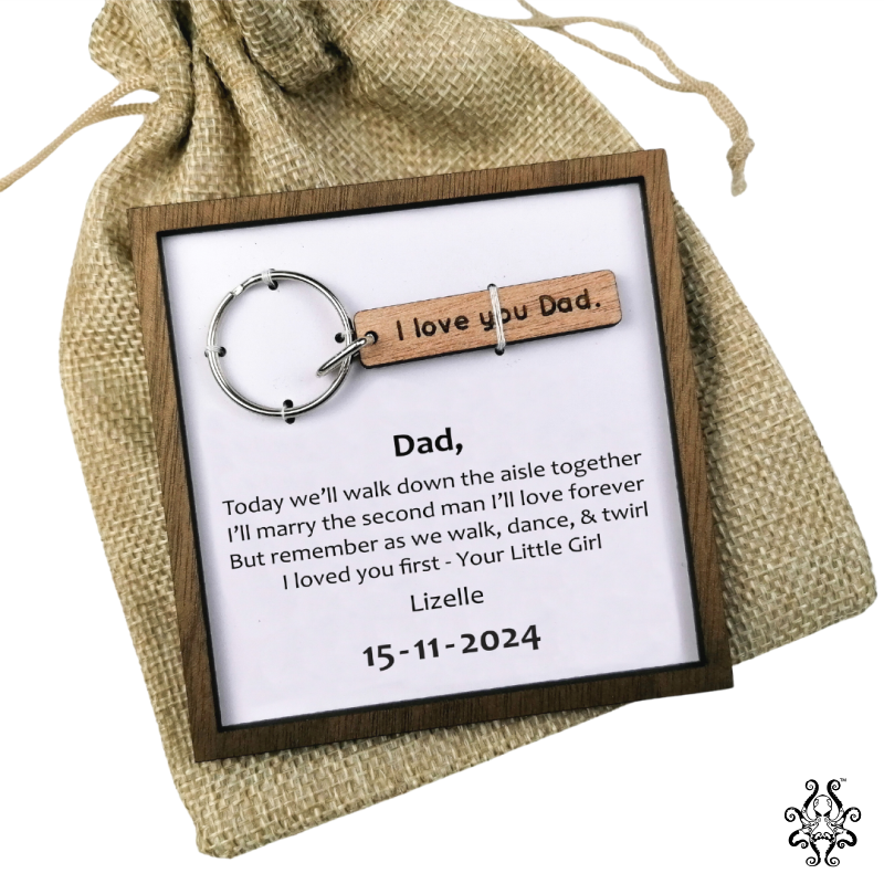 Celebrate the bond between a father and his daughter on her wedding day with this unique Father of the Bride Gift Keychain with a Personalised Message. Crafted with attention to detail, ensuring it’s both beautiful and memorable. The personalised message is engraved on high-quality white melamine, giving it a clean, elegant look that stands out. It’s framed in a luxurious walnut veneer, adding warmth and richness to the design. This gift is the perfect way to honor the special role a father plays in his daughter’s life.