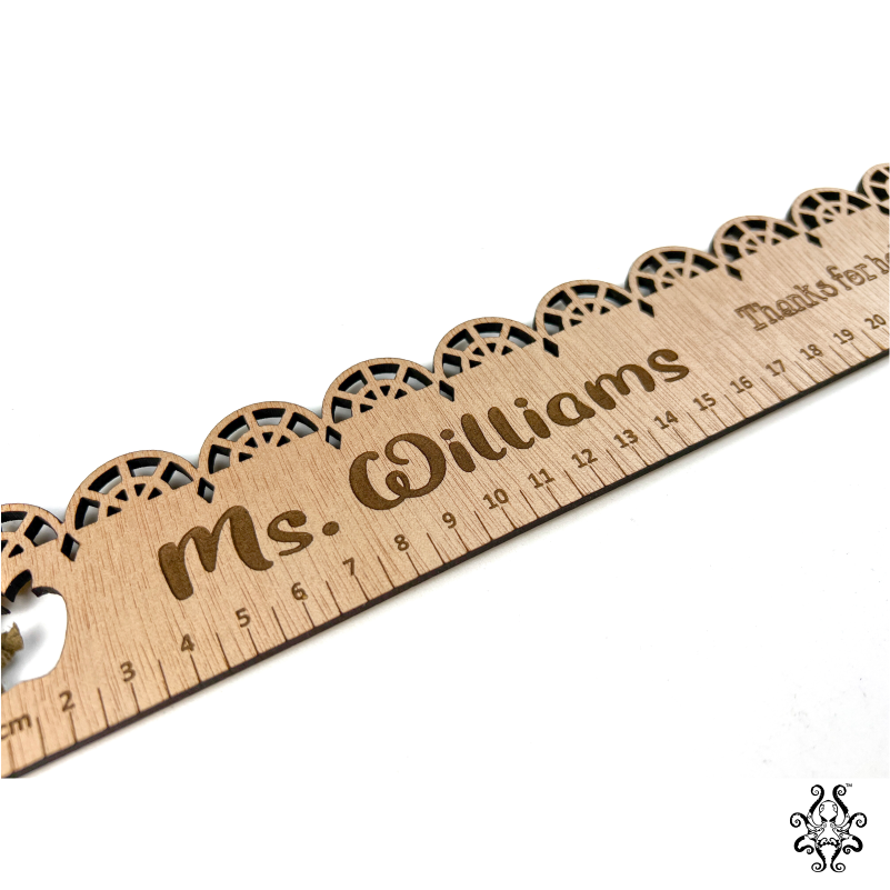 Crafted from premium wood, it combines durability and elegance. Measuring 30 cm, it’s more than just a ruler—it’s a symbol of the important role teachers play. The ruler is designed with intricate cut-out patterns along the top edge, adding a touch of charm and sophistication to a practical tool.