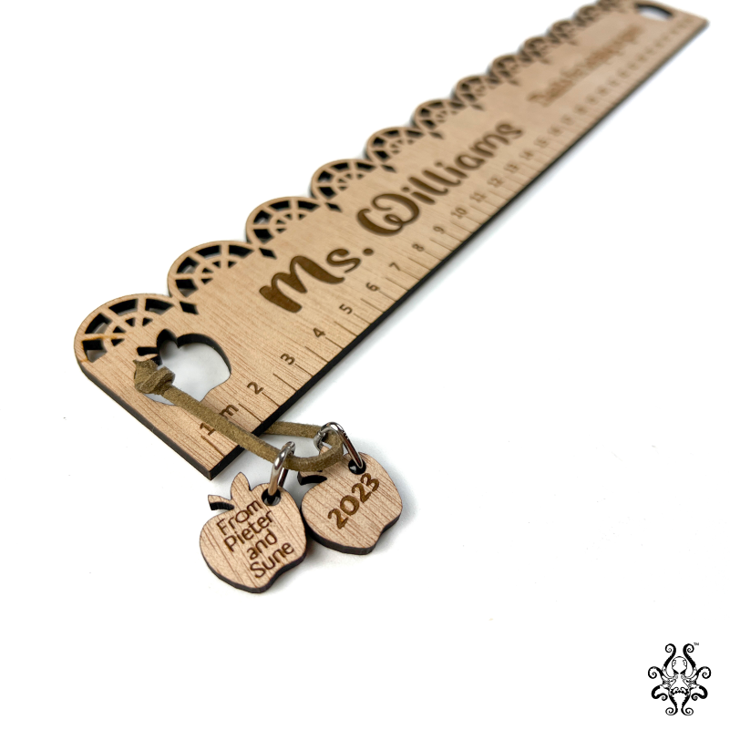 What makes this Ruler truly special is the option for personalization. Engrave the teacher’s name and a warm message: “Thanks for helping us grow!” This heartfelt engraving is a daily reminder of their hard work and dedication. You can also include a small engraved apple charm, featuring your child’s name and the year “2023.” This unique touch ensures the ruler becomes a lasting token of appreciation for any teacher.