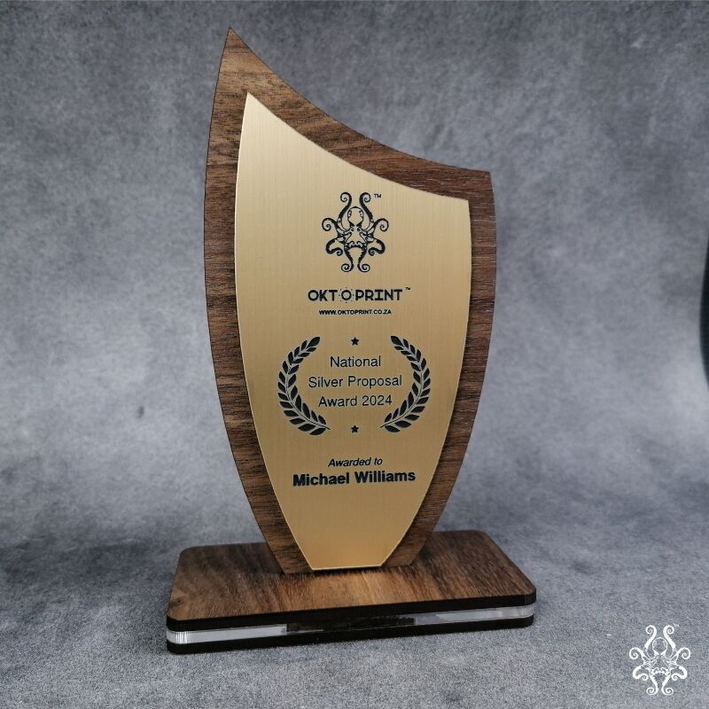 The Shield Plaque Trophy is crafted with high-quality walnut veneer and a gold ABS plate. The walnut veneer base offers natural warmth and durability, ensuring the award remains a beautiful keepsake for years. The gold ABS plate adds a touch of luxury and serves as the perfect backdrop for personalized engraving. This trophy’s materials were chosen for their elegance and strength, resulting in a unique piece that stands out in any setting.