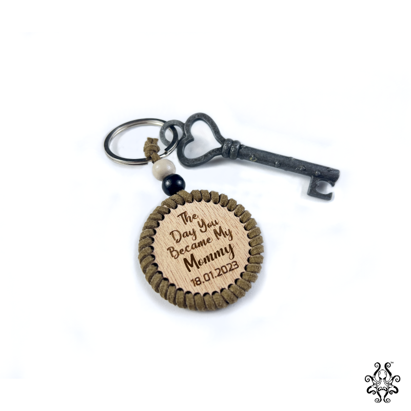 Celebrate the unforgettable moment with The Day You Became My Mommy Keychain. This elegant and stylish keepsake is crafted to mark the day your life changed forever. Featuring a personalized engraving, it ensures that the sentiment of the special day remains close to her heart. The natural wood disc is carefully engraved with a custom message and date, making each keychain truly unique.
