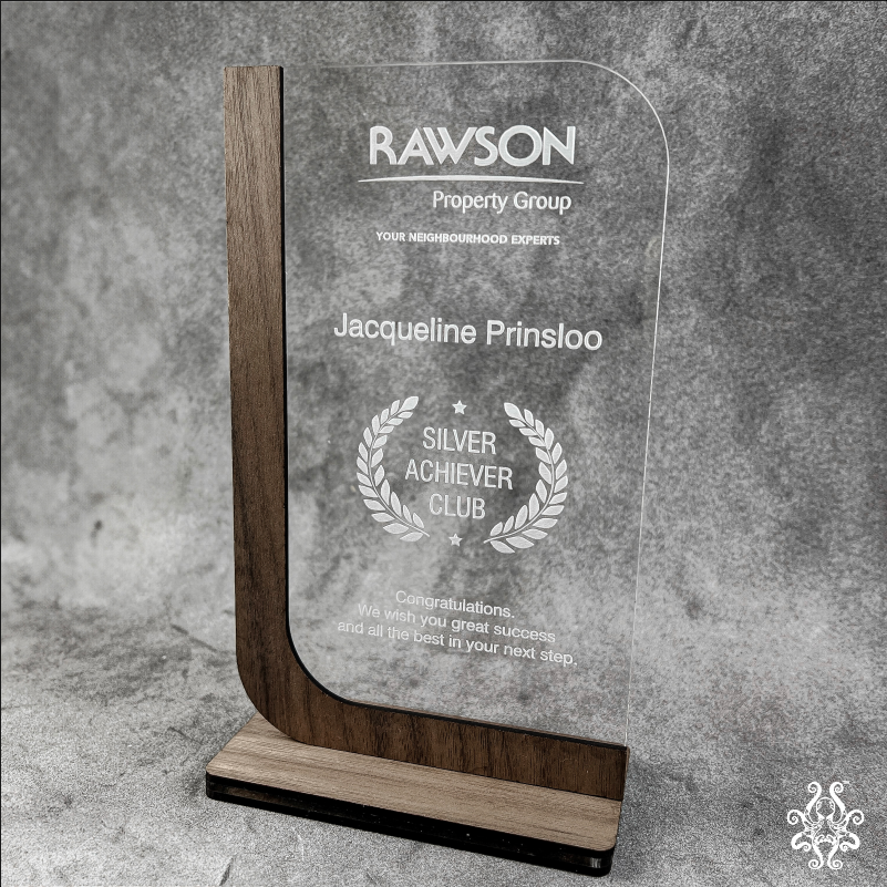 Our trophy is meticulously crafted from high-quality wood and clear acrylic, combining the natural warmth of wood with the sleek, contemporary look of acrylic. The sturdy wooden base supports a clear acrylic panel, etched with your company logo, the recipient’s name, and their prestigious honorary title. This unique combination creates a striking design that stands out, making it not just a trophy, but a statement piece.