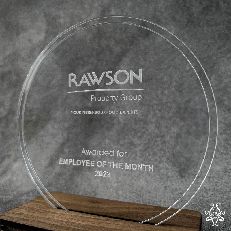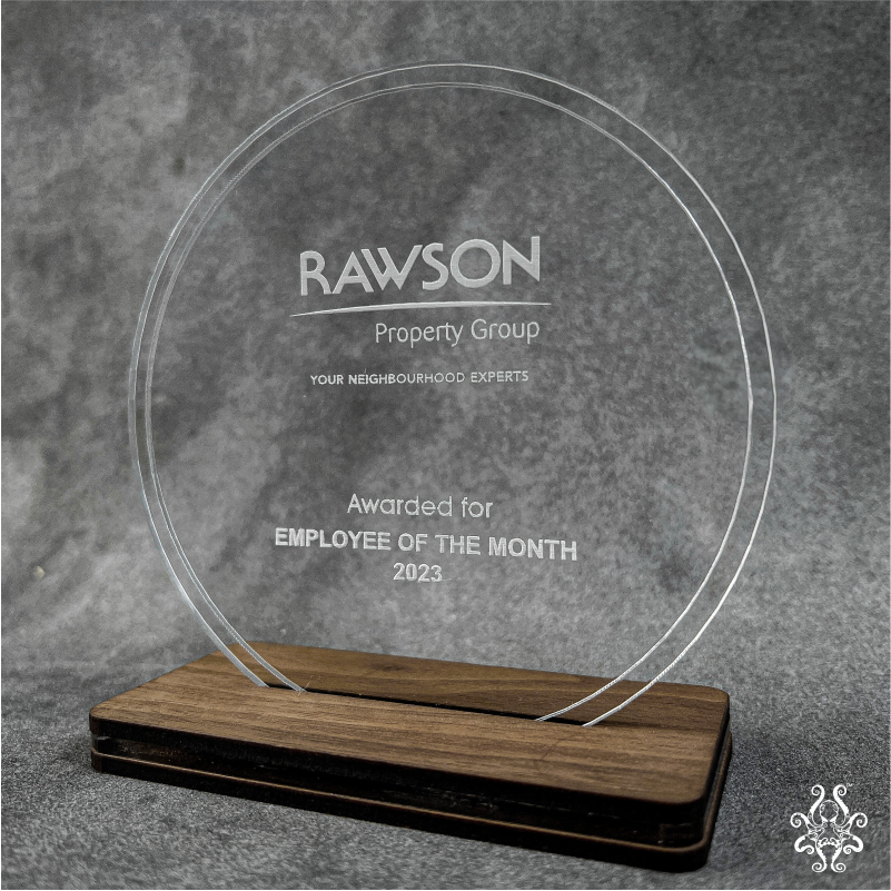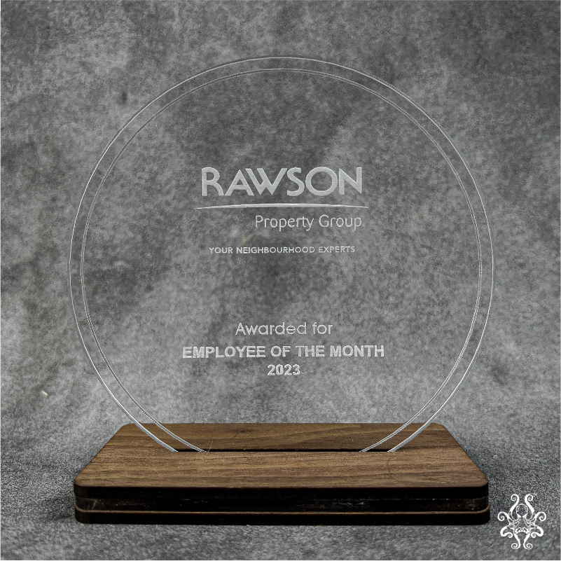 Our Awards Trophy is made from a premium combination of clear acrylic and wood. The round acrylic panel sits on a solid wooden base, creating a sleek and modern look that complements any office décor. Built to last, making it a meaningful and lasting keepsake.