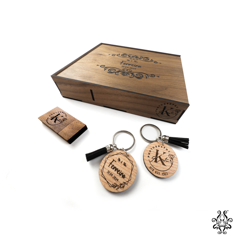 The USB drive, encased in a matching wooden shell, offers ample space to store high-resolution wedding photos and videos. This thoughtful design ensures that all components of the box are cohesive and visually appealing. The photographer’s logo is elegantly engraved on the USB, the side of the box, and one side of each keychain. By doing so, consistent branding is achieved across all items, making the Wedding Photography Box an invaluable tool for professional photographers.