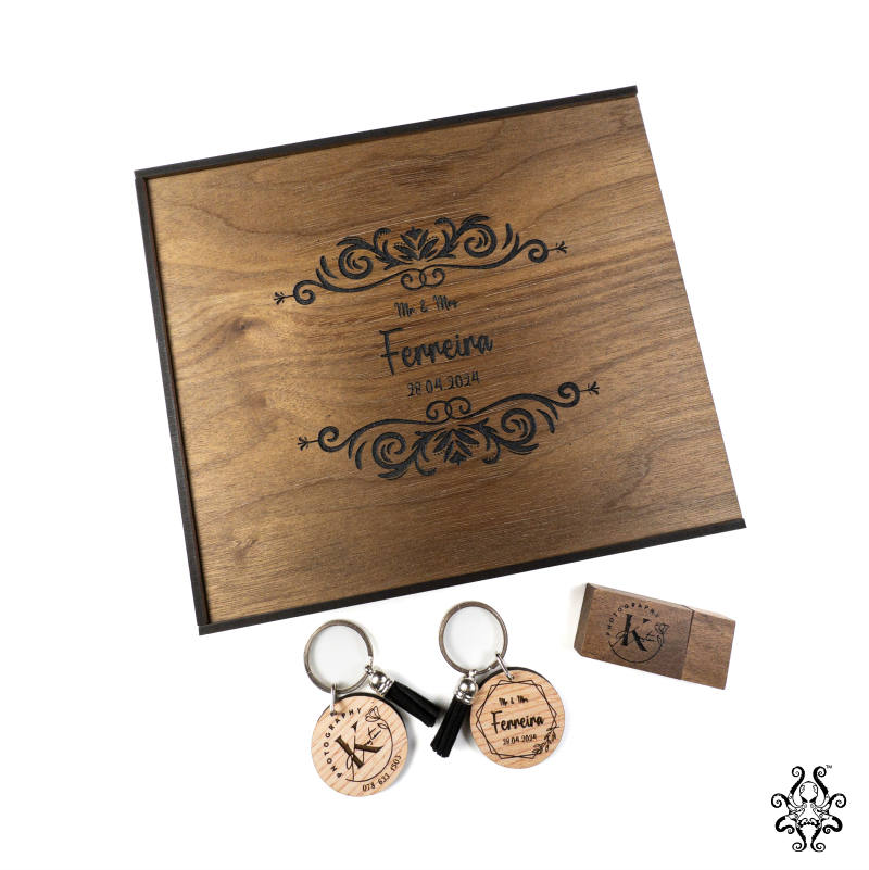 In this exquisite Wedding Photography Box set, you will find a finely crafted wooden box, two personalized keychains, and a 16GB 3.0 USB drive. The wooden box features a smooth, natural finish with a sliding lid, which adds a touch of elegance. Engraved on the lid are the couple’s surname and wedding date, creating a unique memento that they will treasure forever. Moreover, each keychain showcases the photographer’s logo on one side and the couple’s details on the reverse. These keychains not only serve as lovely keepsakes but also subtly promote the photographer’s brand, providing an excellent opportunity for brand recognition.